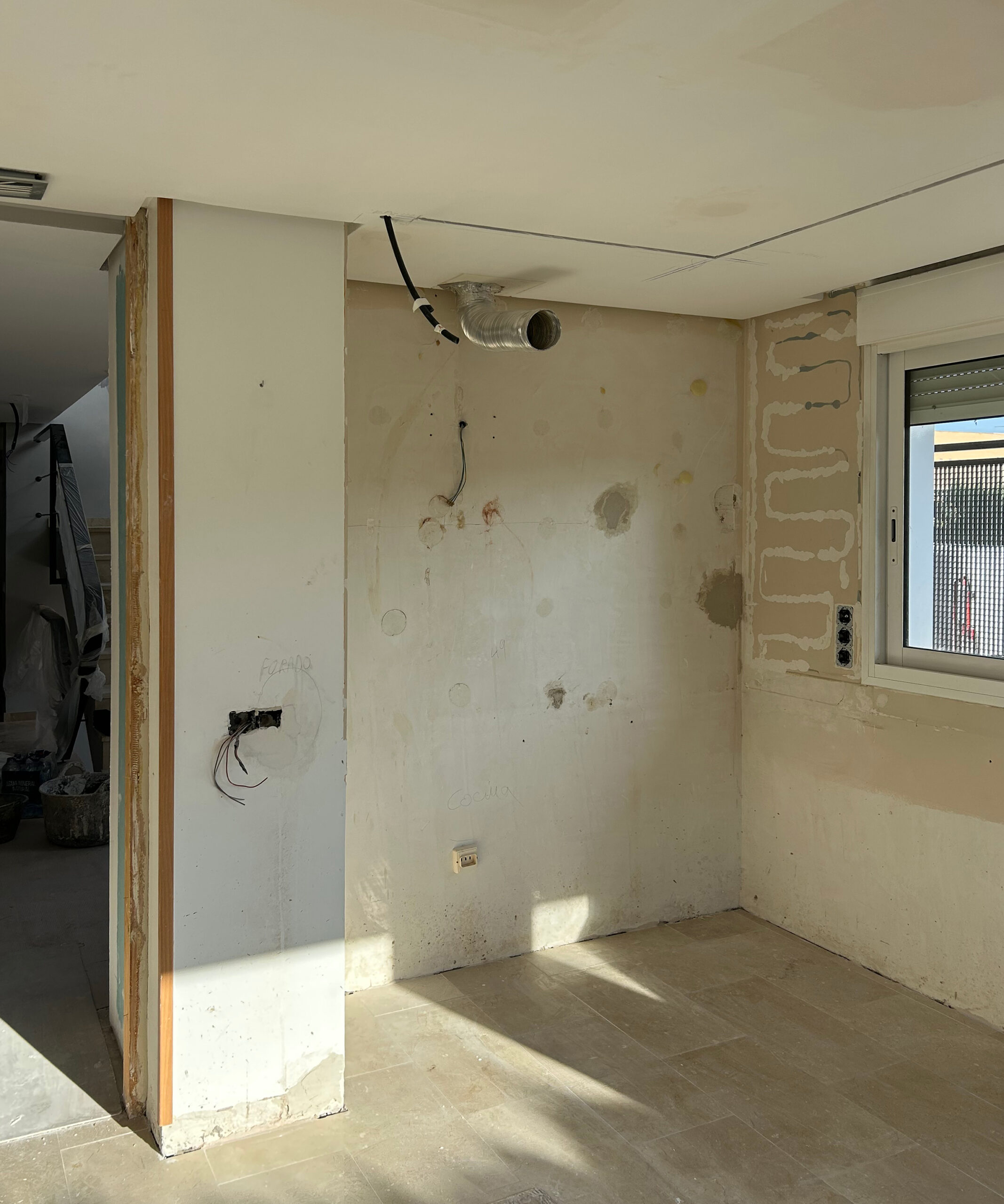 Asimismo, se reforzaron los tabiques en las zonas que lo requerían para garantizar la solidez de las futuras instalaciones. En este punto, el techo fue también objeto de refuerzo, preparándolo específicamente para la colocación de una guía empotrada, asegurando no solo su correcta sujeción, sino también una integración discreta y estética en el conjunto del espacio.