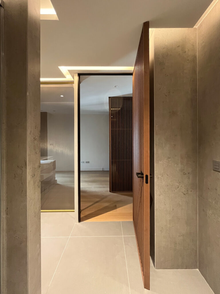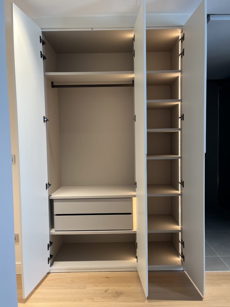 El vestidor se ha integrado perfectamente en el diseño general del proyecto, utilizando el sistema Spazio de Rimadesio para cerrar el espacio de manera discreta y elegante. La puerta corredera Sail permite una apertura fluida y sin interrupciones, manteniendo la continuidad visual y funcional del entorno.