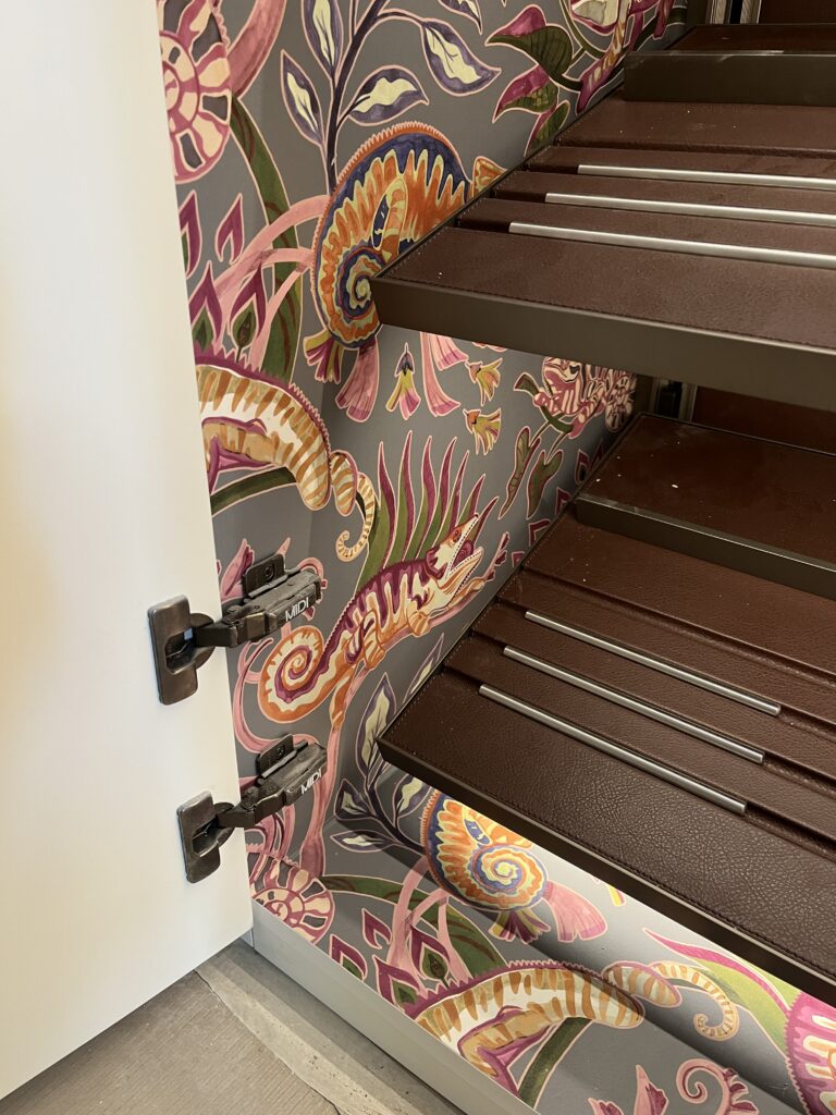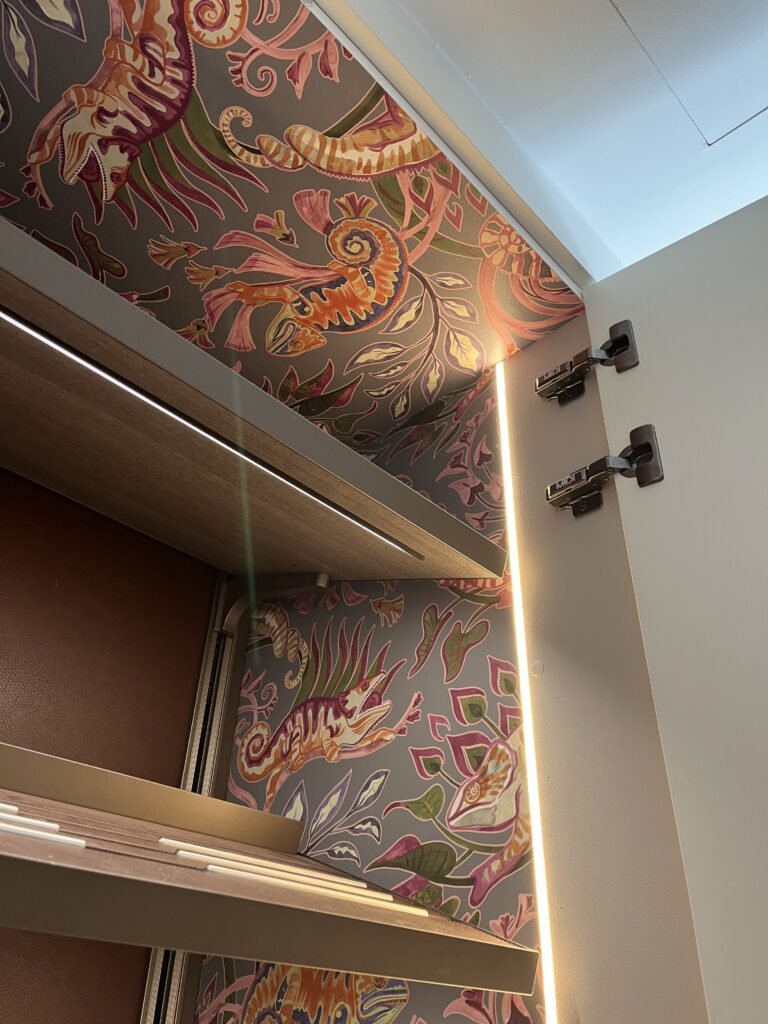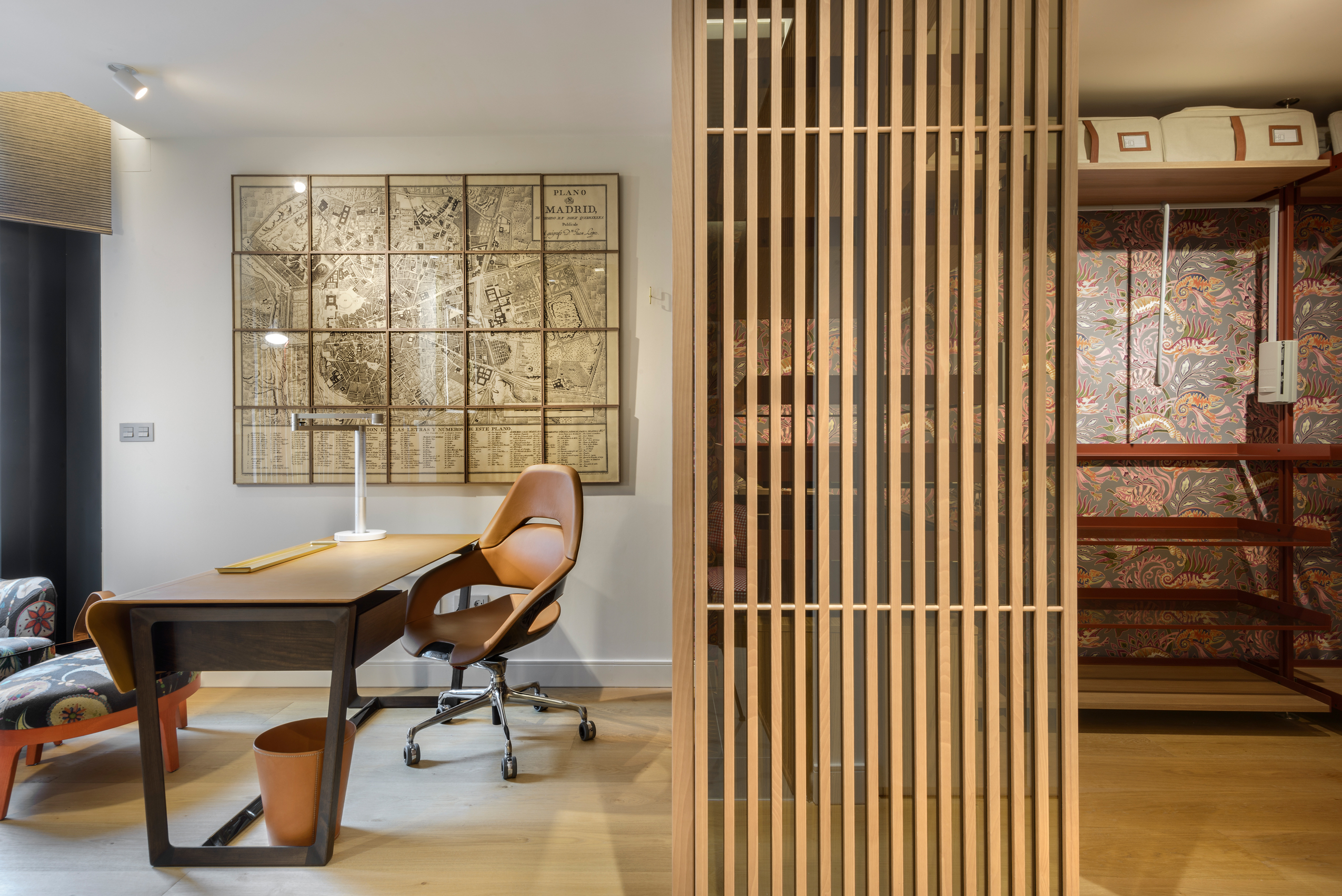 Ambos espacios se han forrado con un papel de alta calidad, cuidadosamente seleccionado por sus texturas y tonalidades creando continuidad visual entre ellos.