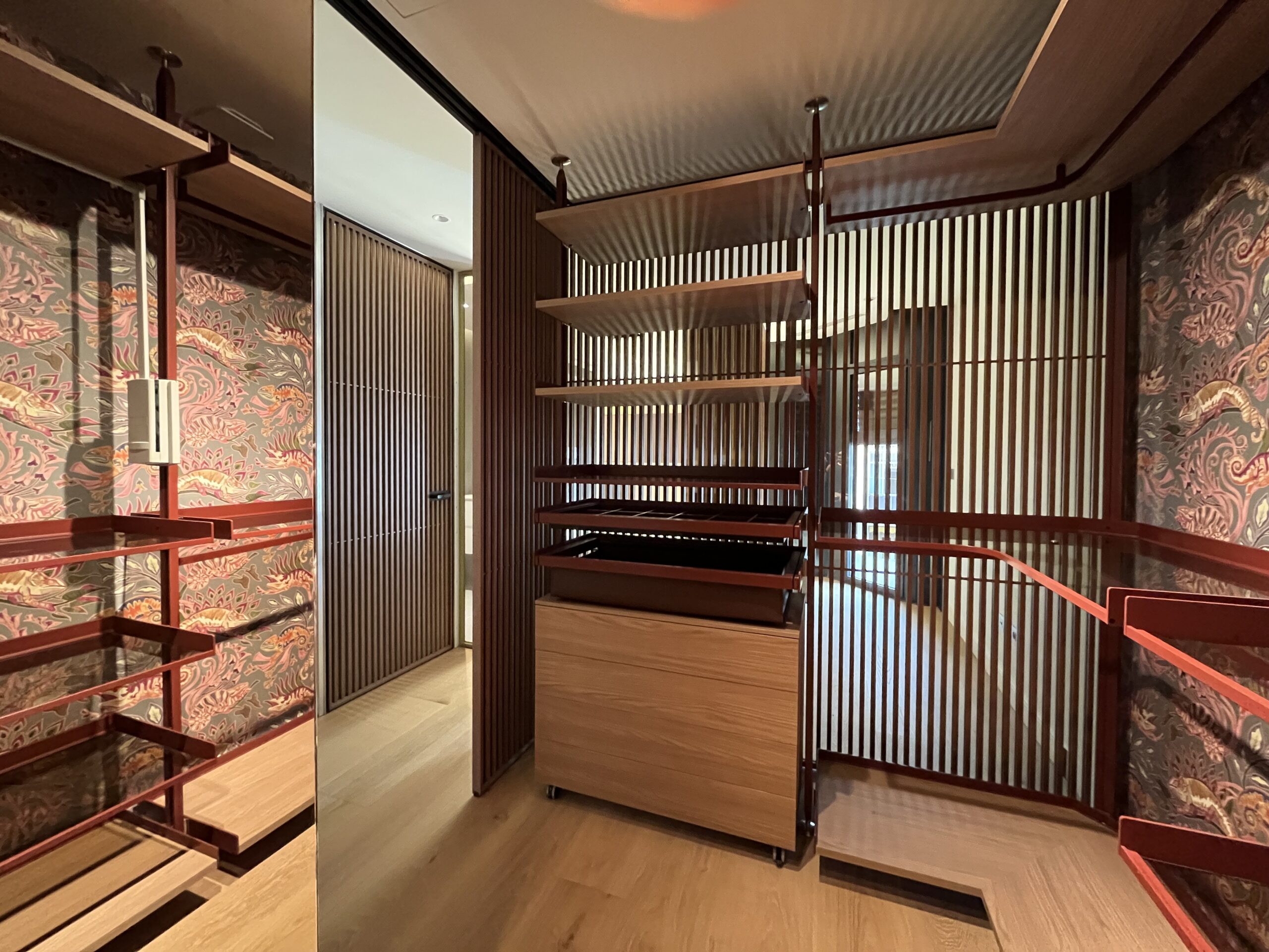 El vestidor se estructura utilizando el sistema modular Zenit Night de Rimadesio, reconocido por su versatilidad y capacidad de adaptación a espacios de alto nivel. Este sistema permite una configuración a medida, optimizando cada centímetro disponible y adaptándose perfectamente a las necesidades y deseos del usuario. Los elementos se integran armoniosamente, creando un ambiente de sofisticación y orden.