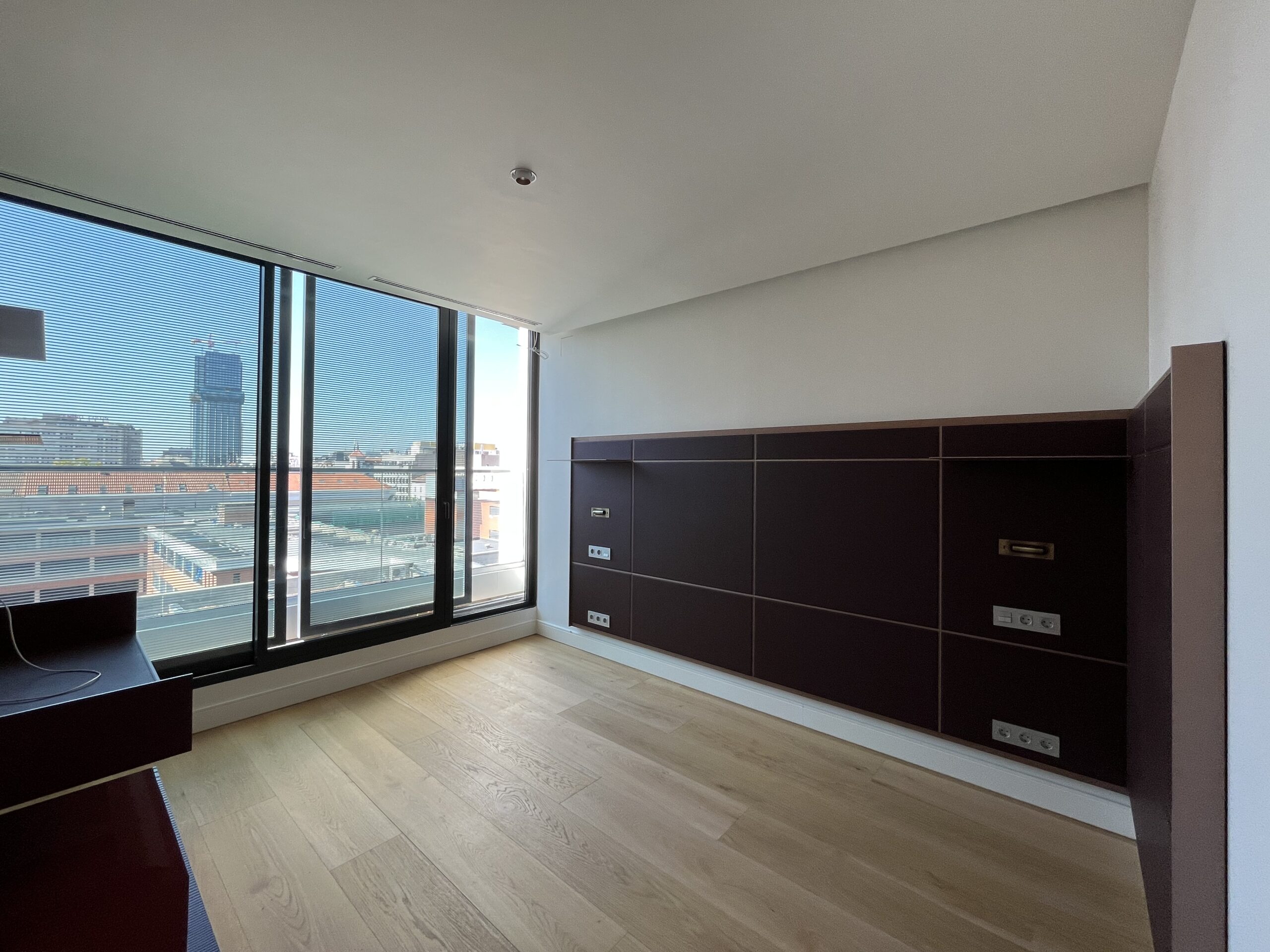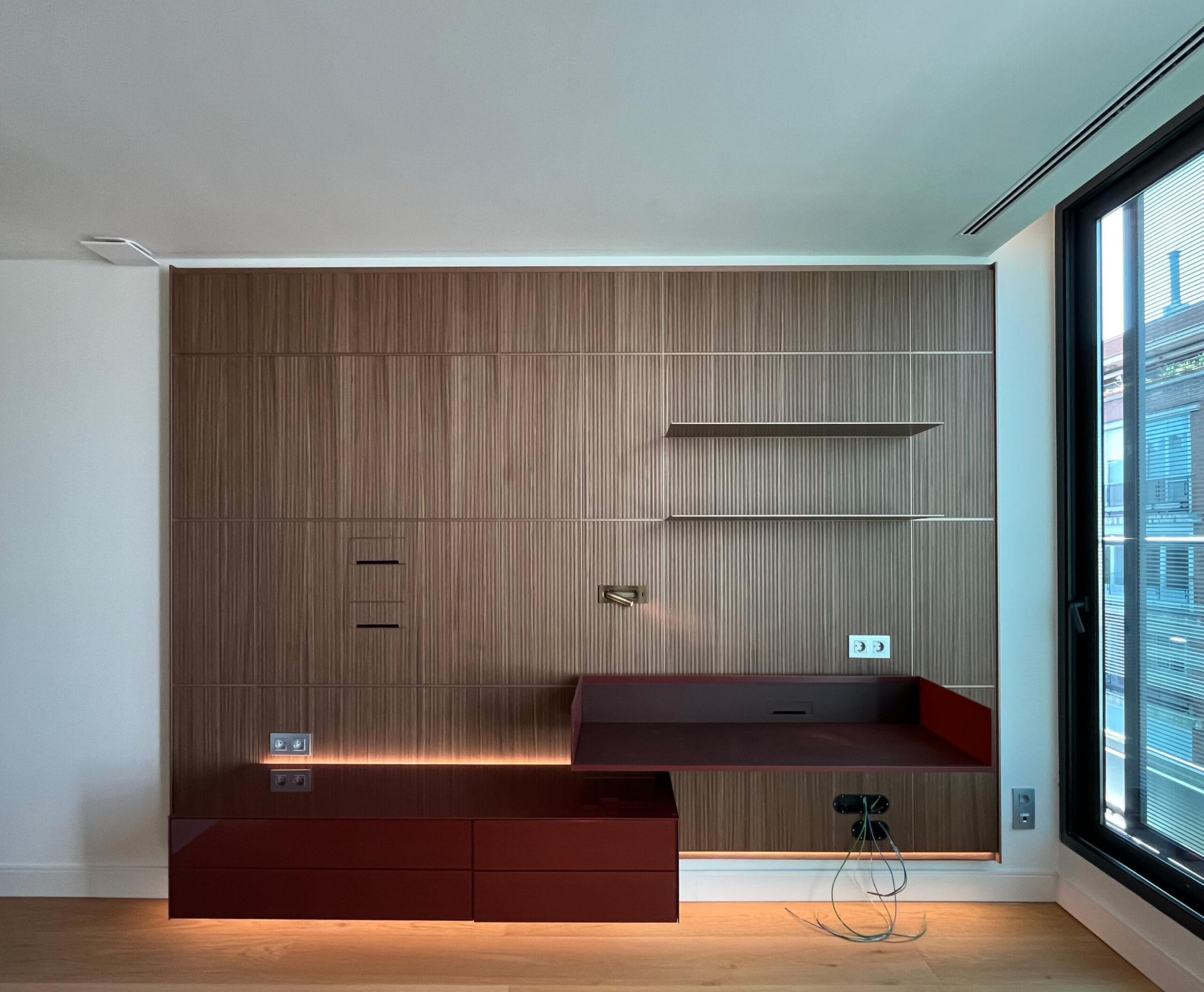 Enfrente de la cama, se ha desarrollado una composición funcional y estética que integra una zona específica para la instalación de televisión, acompañada de una mesa de trabajo que responde a las necesidades contemporáneas de versatilidad y confort.