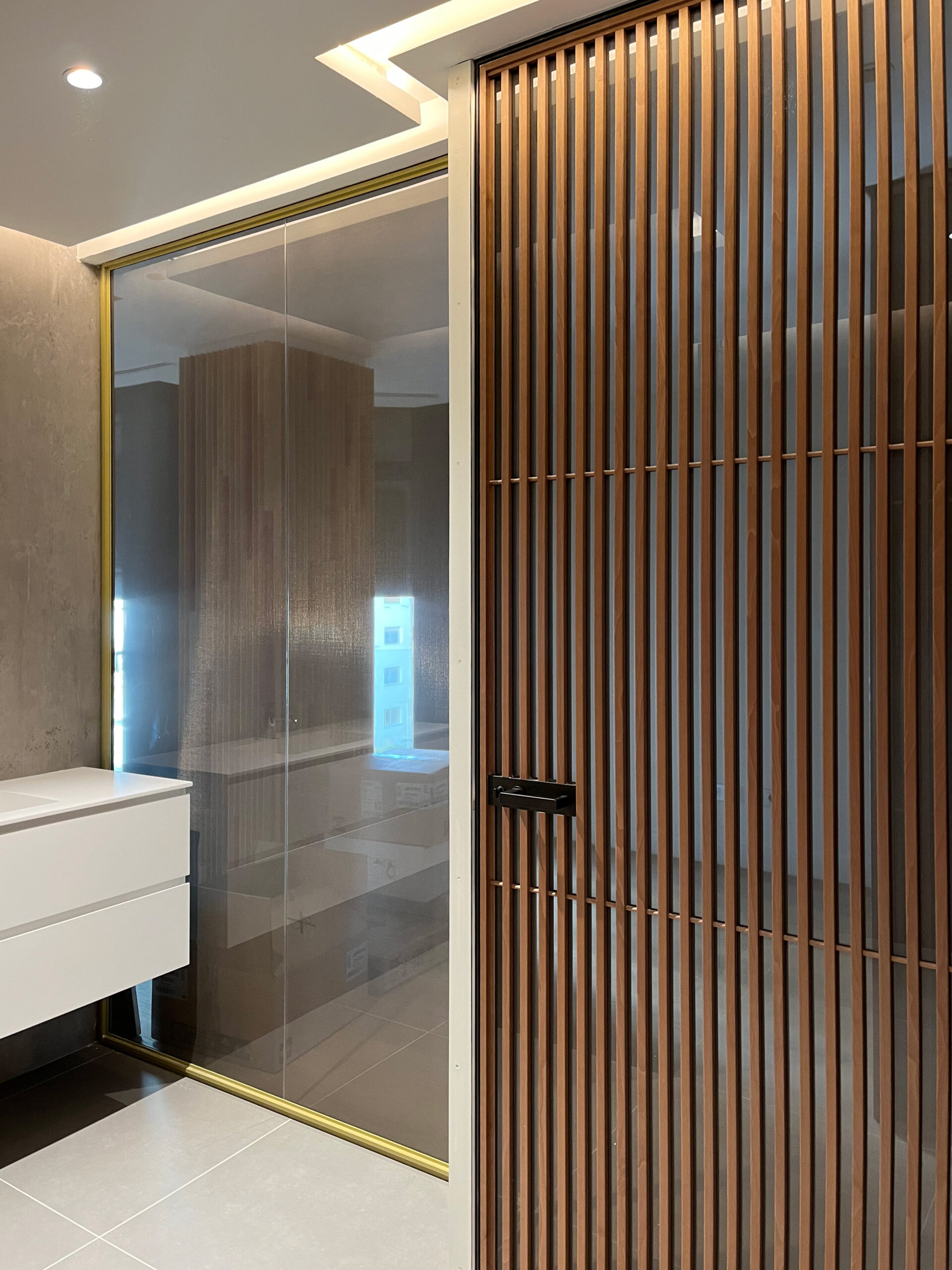 Originalmente, el baño estaba integrado directamente en el dormitorio, sin ningún tipo de separación, aunque contaba con un foseado de luz que reforzaba su conexión visual con el espacio principal. Para mejorar la funcionalidad y aportar mayor privacidad, se ha instalado el sistema Spazio de Rimadesio, creando un cerramiento que separa el baño del dormitorio sin renunciar a la entrada de luz natural ni a la sensación de amplitud.