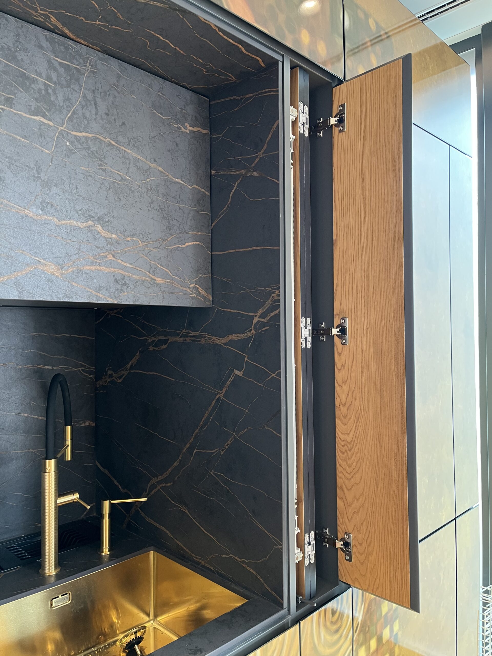 Cuando las puertas están cerradas, actúan como un fondo decorativo que oculta por completo la cocina, aportando una sensación de orden y sofisticación. Gracias a un sistema de puertas escamoteables, es posible ocultar o mostrar los elementos funcionales de la cocina según el uso, convirtiéndola en una estancia versátil que se adapta al ritmo de la vivienda.