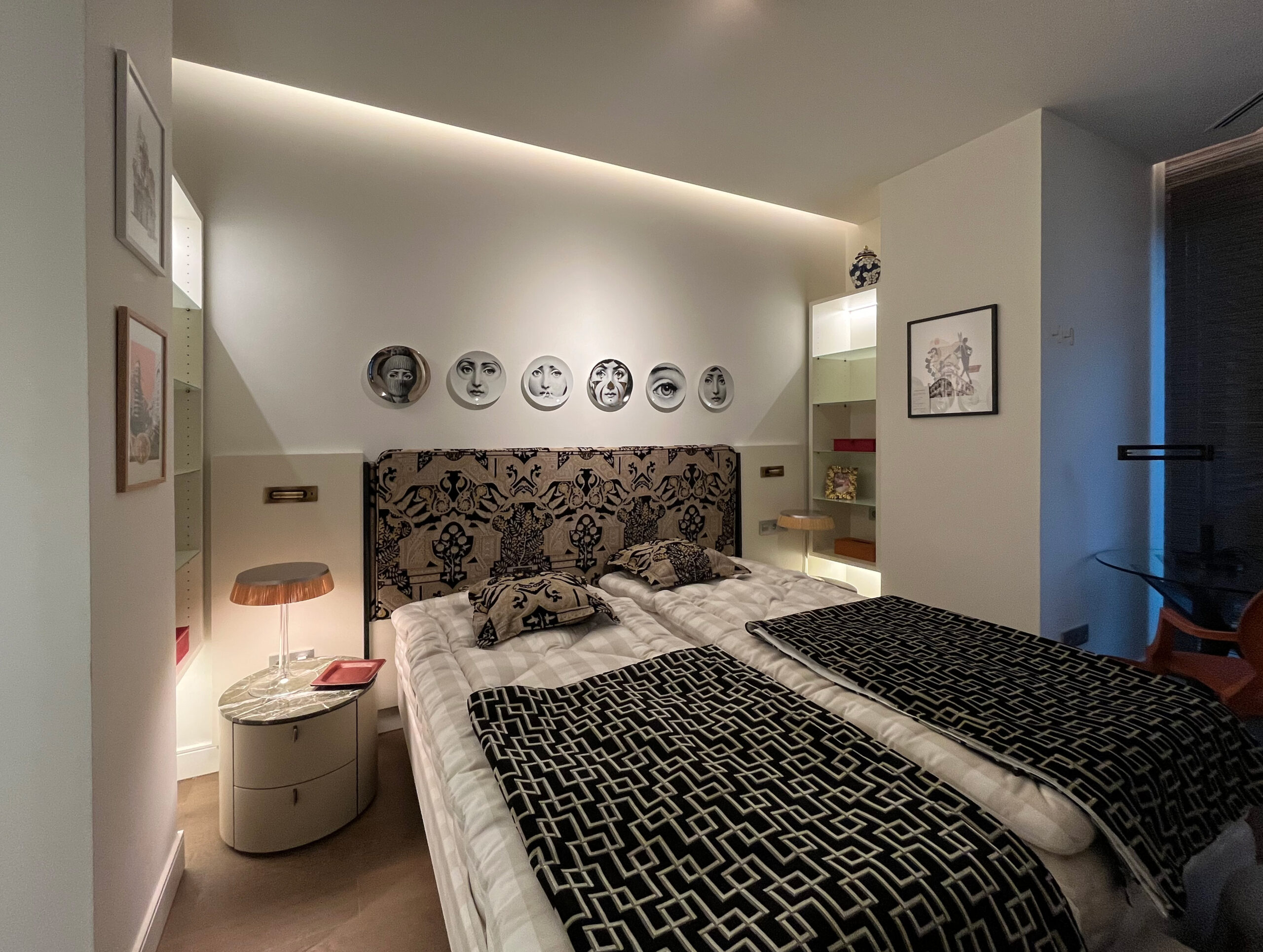 En el proyecto Madrid I, los cabeceros se convirtieron en piezas protagonistas del diseño de los dormitorios. Cada uno fue diseñado y fabricado a medida por nuestros carpinteros, utilizando maderas nobles y lacados de acabado impecable. La integración de iluminación indirecta no solo realza la textura de los materiales, sino que aporta una atmósfera cálida y envolvente, convirtiendo el cabecero en un elemento funcional y decorativo a la vez.