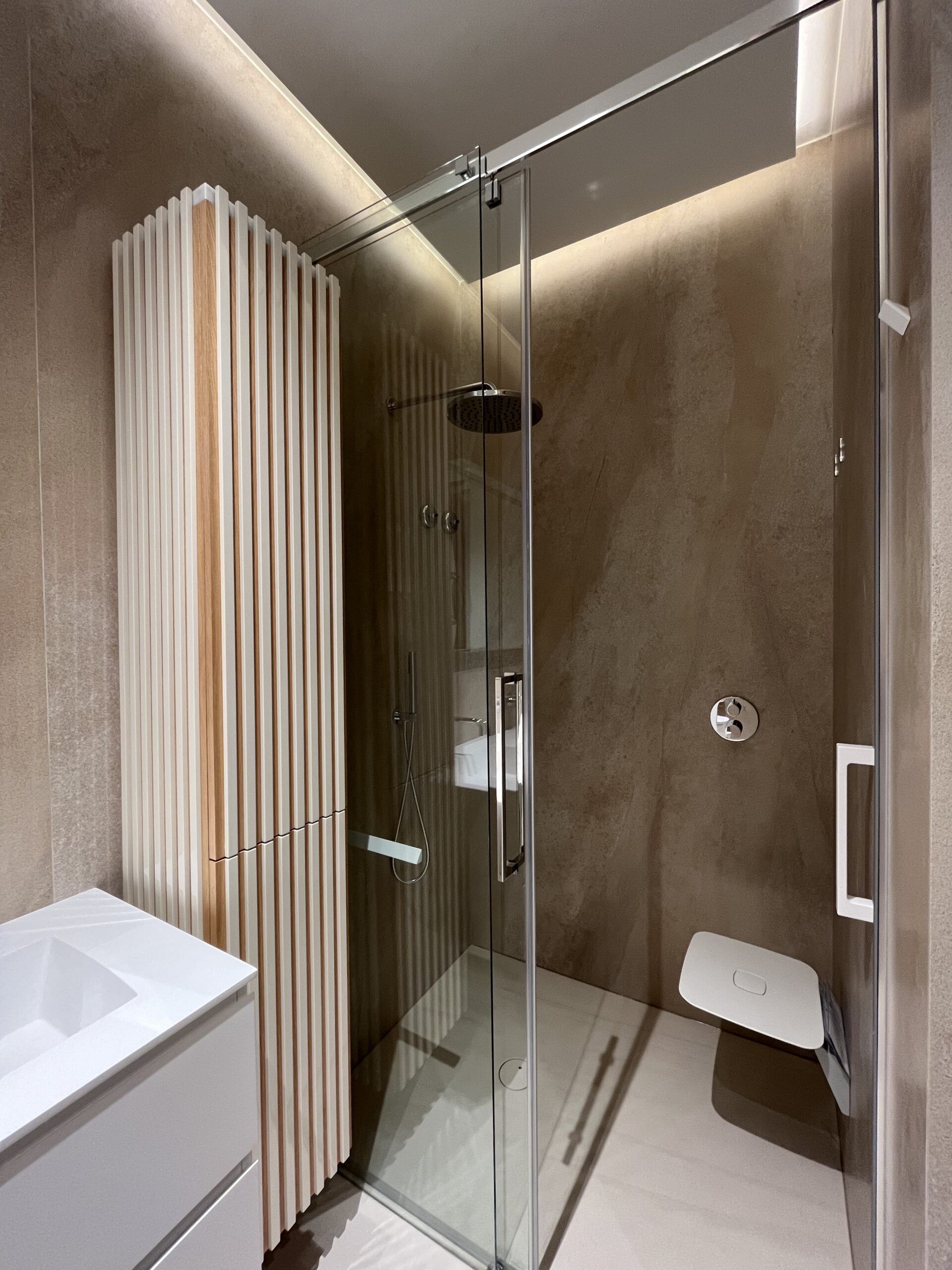 En el proyecto Madrid II, los armarios de baño fueron diseñados y fabricados a medida con una pailería de madera maciza, que aporta una calidad y calidez excepcionales al espacio. La precisión artesanal en el trabajo de la pailería crea un juego de texturas y sombras que enriquece el diseño, transmitiendo elegancia y sofisticación.