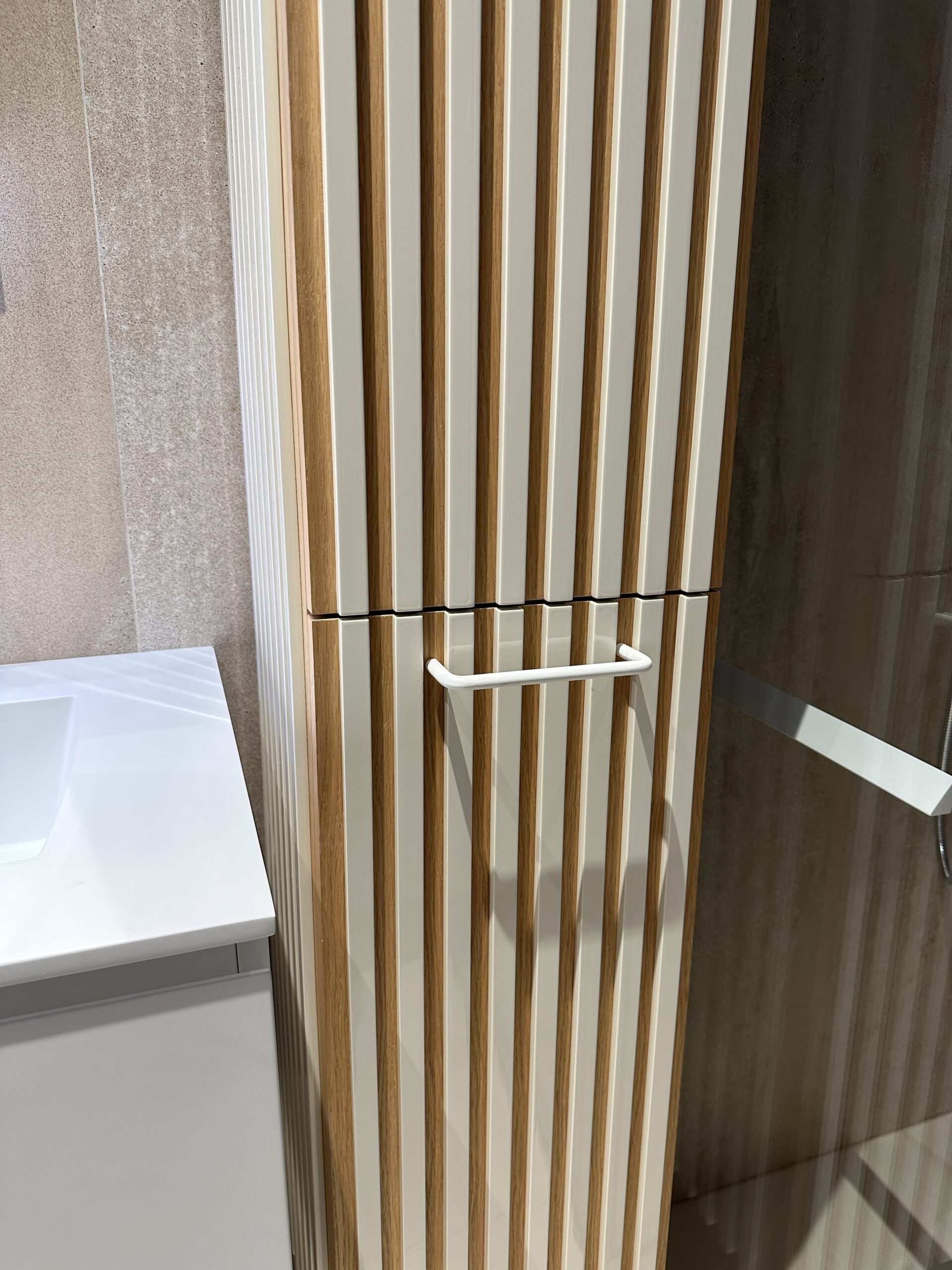 En los baños de este proyecto, se diseñaron y fabricaron a medida armarios con estructura rechapada en madera y pallilería lacada en blanco, creando un equilibrio perfecto entre la calidez de la madera y la pureza del lacado. El diseño de pailería, trabajado con precisión, aporta un ritmo visual elegante que aligera las piezas y añade un toque de distinción.