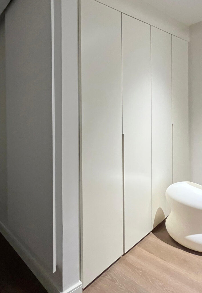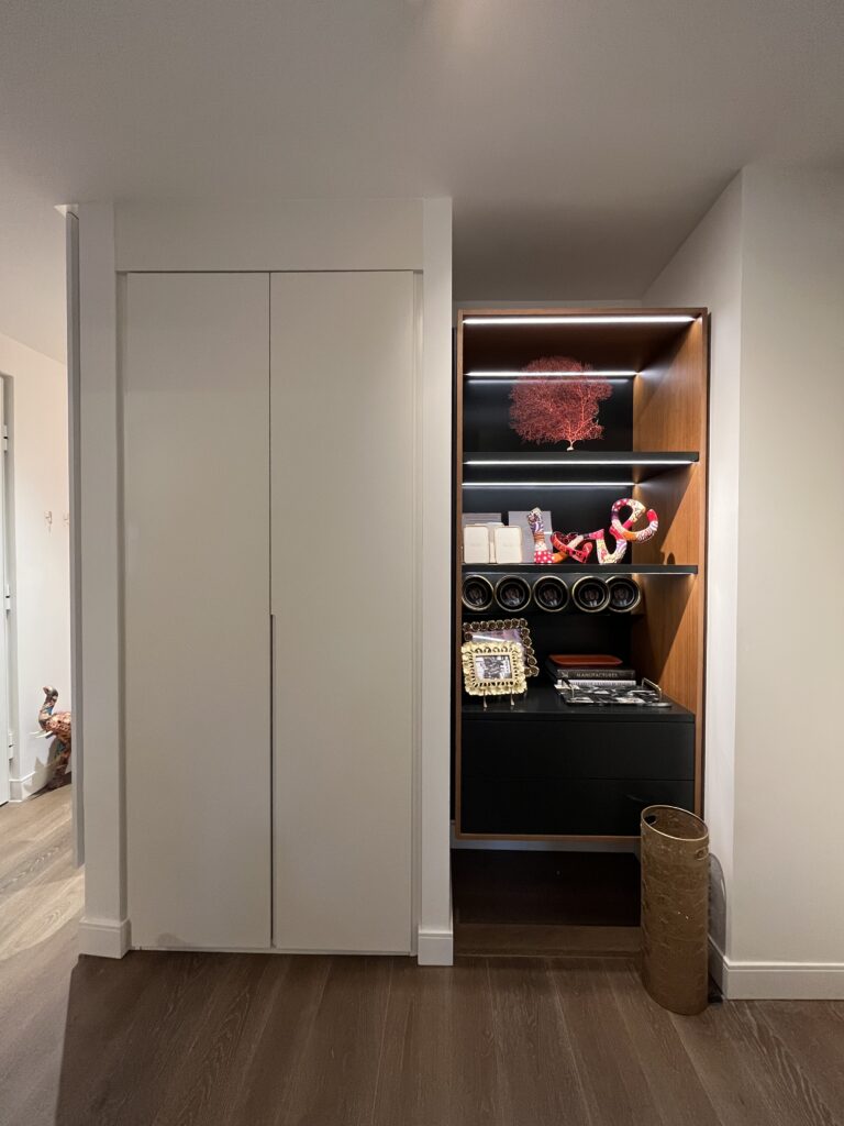 Cada estantería fue diseñada con la misma atención al detalle que caracteriza todo el proyecto: maderas nobles, acabados lacados en tonos suaves y una cuidada integración de la estructura en la arquitectura existente. Así, los espacios dejaron de ser meramente funcionales para convertirse en entornos que combinan orden, estética y personalidad