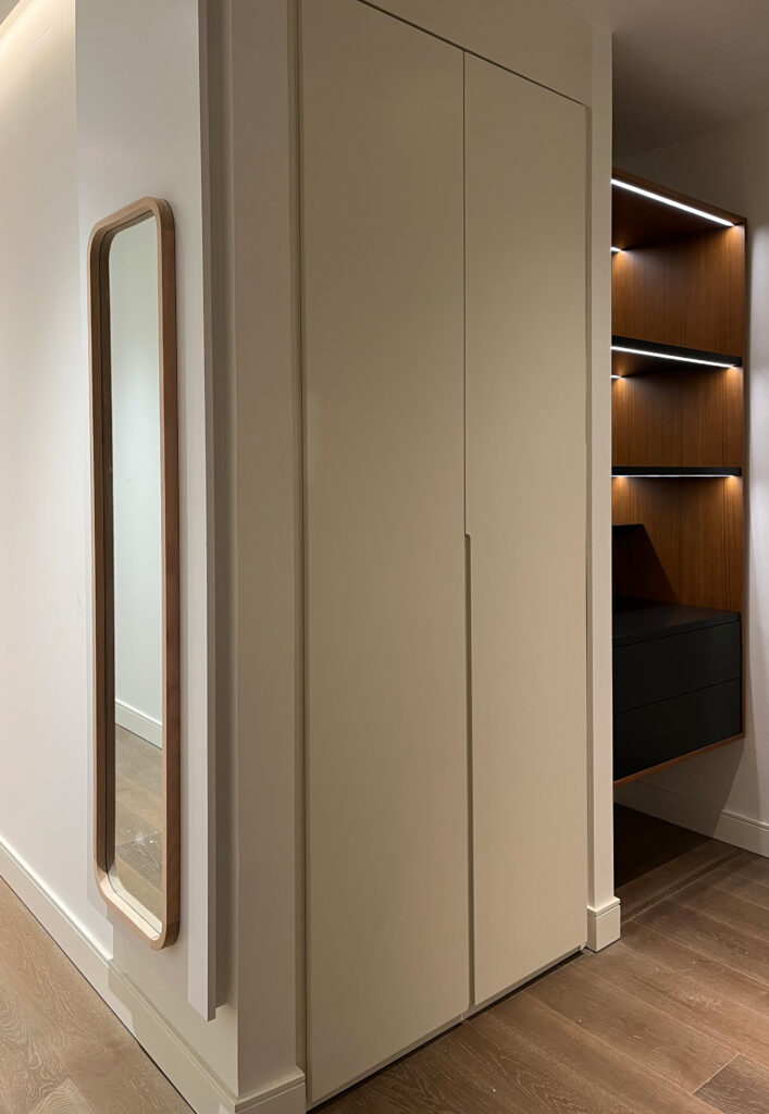 En el proyecto Madrid I, los cabeceros se convirtieron en piezas protagonistas del diseño de los dormitorios. Cada uno fue diseñado y fabricado a medida por nuestros carpinteros, utilizando maderas nobles y lacados de acabado impecable. La integración de iluminación indirecta no solo realza la textura de los materiales, sino que aporta una atmósfera cálida y envolvente, convirtiendo el cabecero en un elemento funcional y decorativo a la vez.