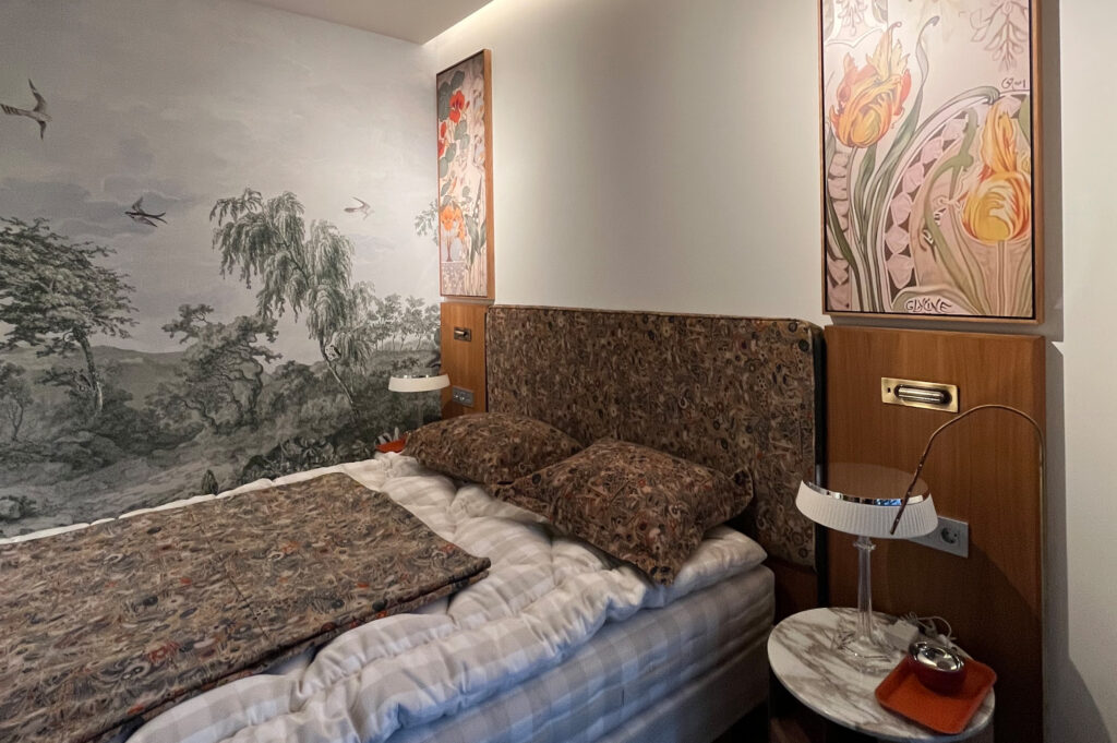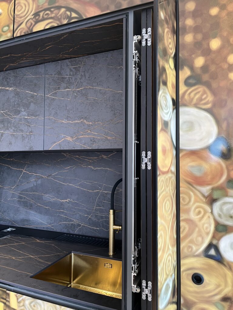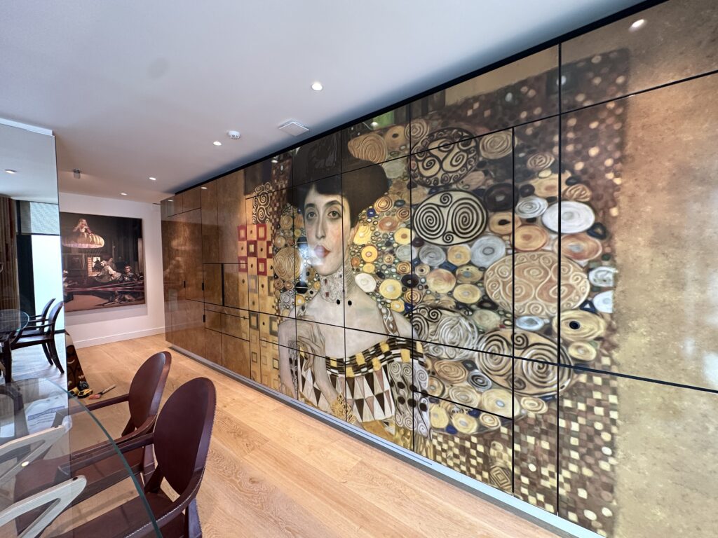 Uno de los ejemplos más singulares de carpintería a medida lo encontramos en la cocina del proyecto MADRID II, concebida desde un enfoque artístico y completamente integrada en el área social de la vivienda. Partiendo de un espacio diáfano en una vivienda de obra nueva, se ha proyectado una cocina a medida cuyo frente de puertas está decorado con un mural de inspiración en Gustav Klimt.