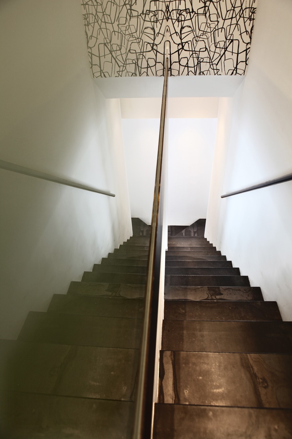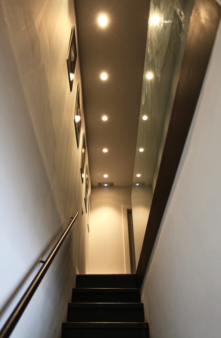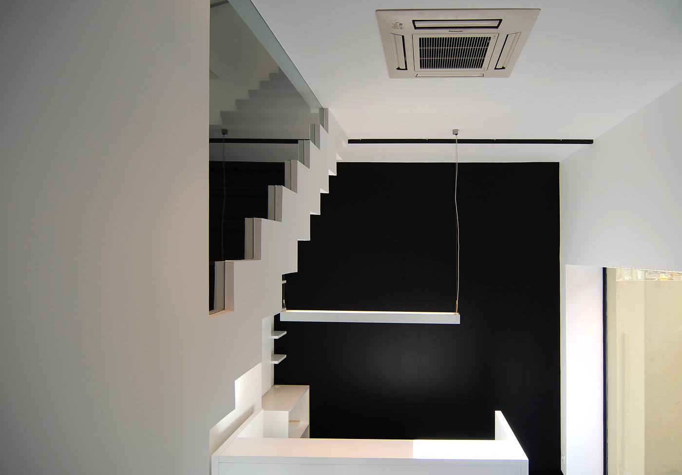 Despejamos la escalera para convertirla en el elemento principal del espacio y gracias a los colores negro y blanco conseguimos unificar la sensación de amplitud.