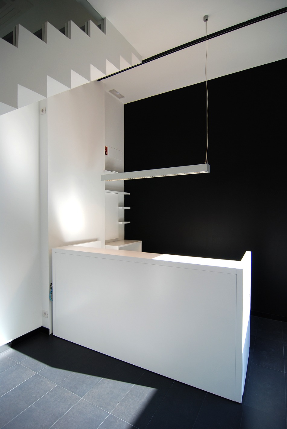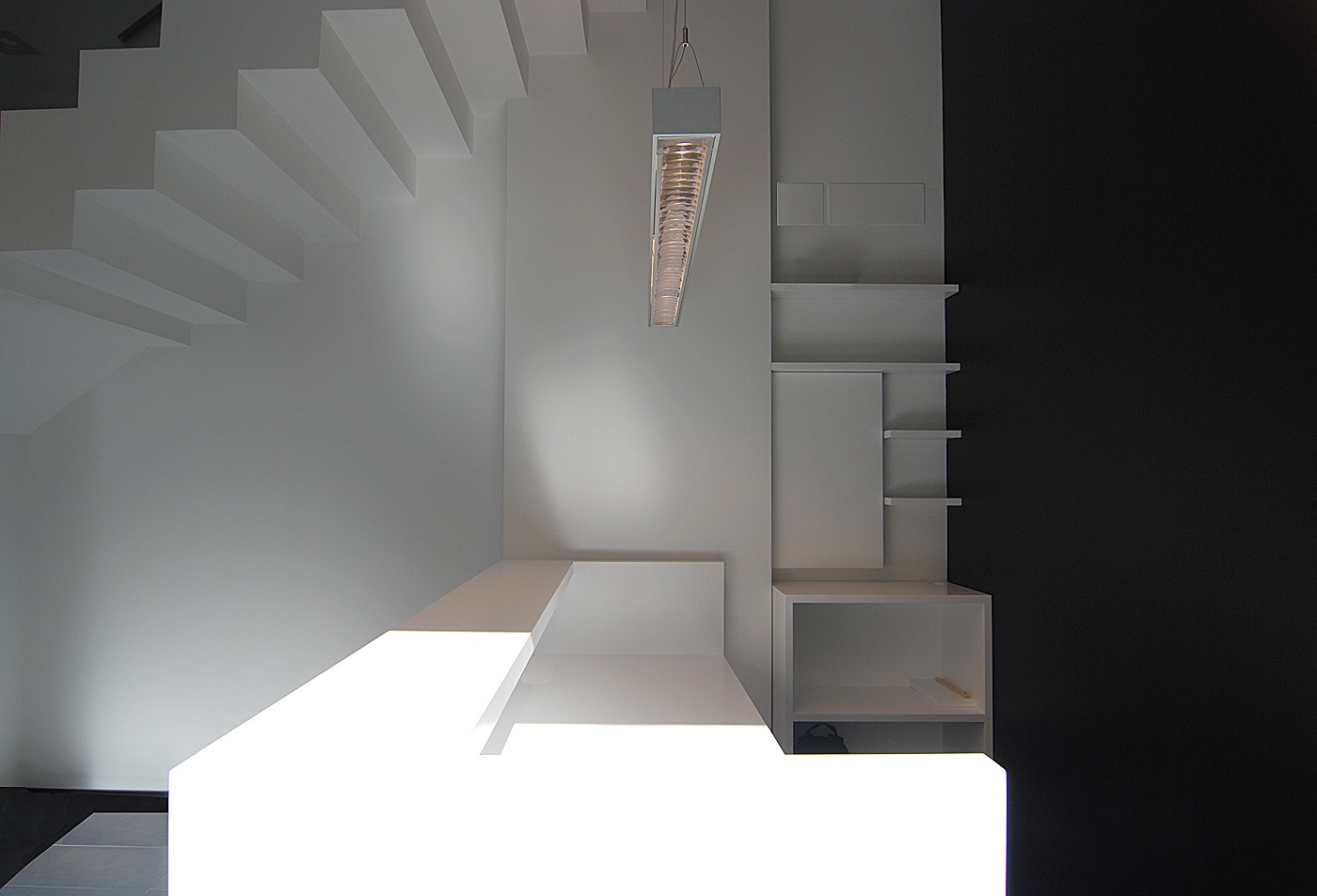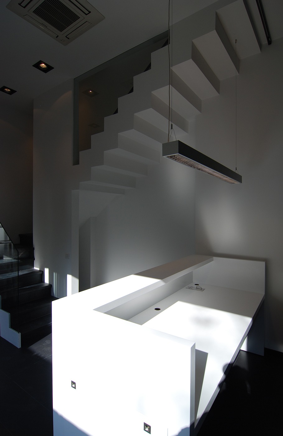Despejamos la escalera para convertirla en el elemento principal del espacio y gracias a los colores negro y blanco conseguimos unificar la sensación de amplitud.
