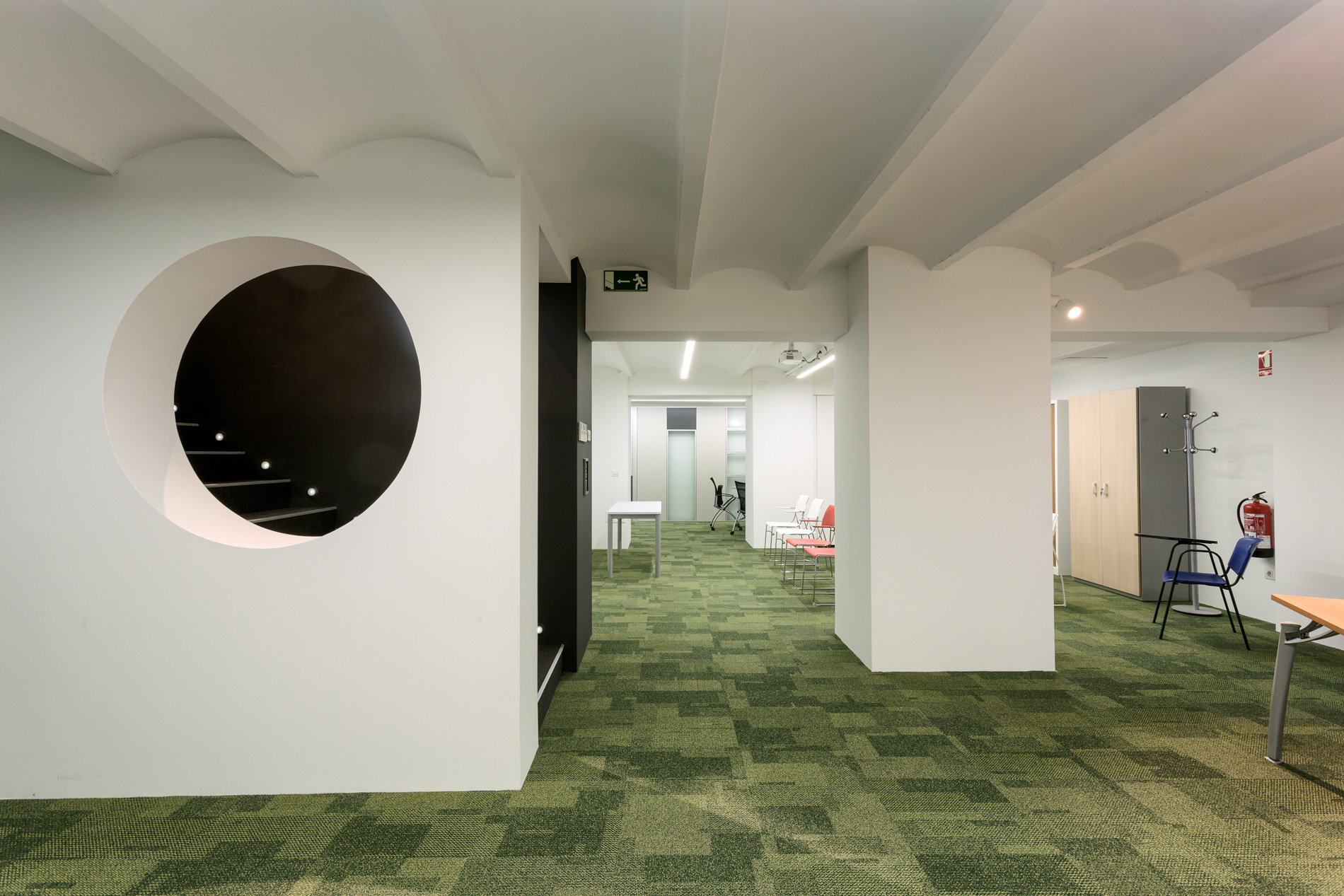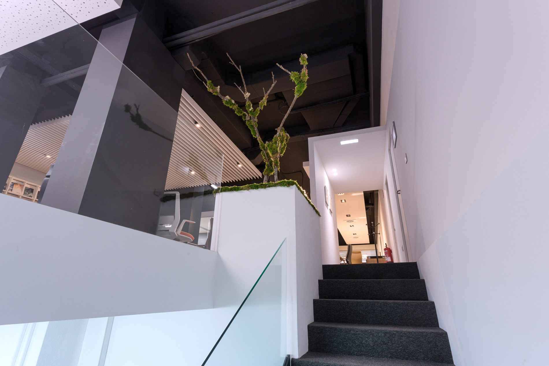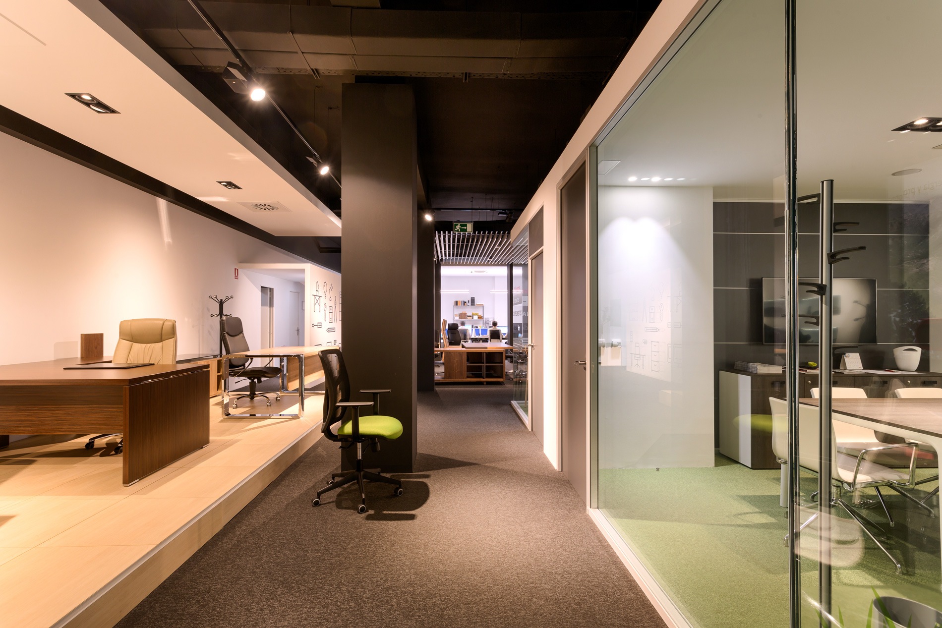 Nos enfrentamos a una completa remodelación de la anterior imagen de la empresa, para ello, después de unir el local anexo y utilizando una moqueta continua tanto en planta baja como en el sótano junto con diferentes tipologías de techos, logramos un aspecto totalmente nuevo en el que destacan perfectamente los mobiliarios de oficina expuestos, consiguiendo un espacio más eficiente y atractivo, donde poder representar la diversidad del producto ofrecido.