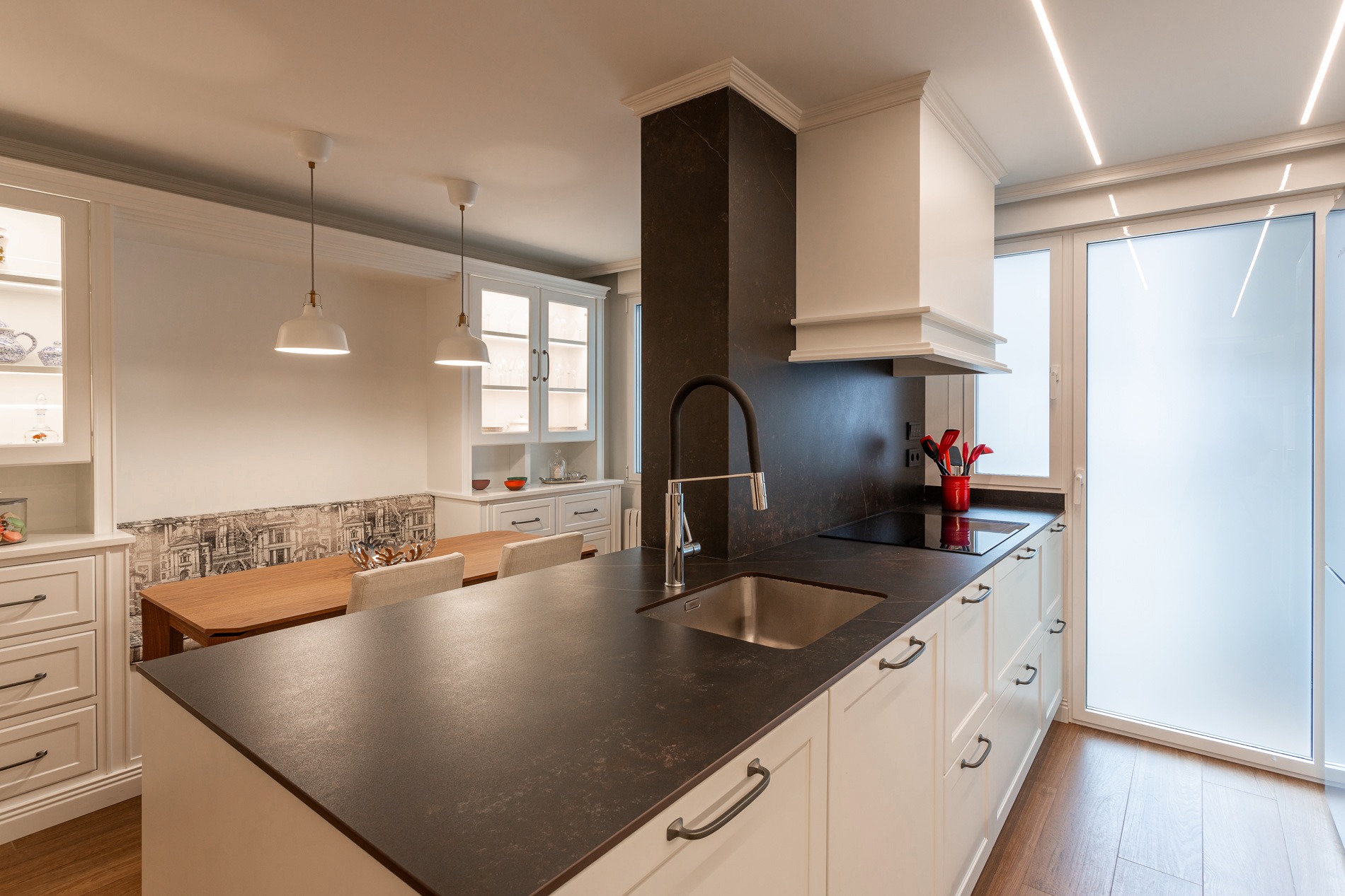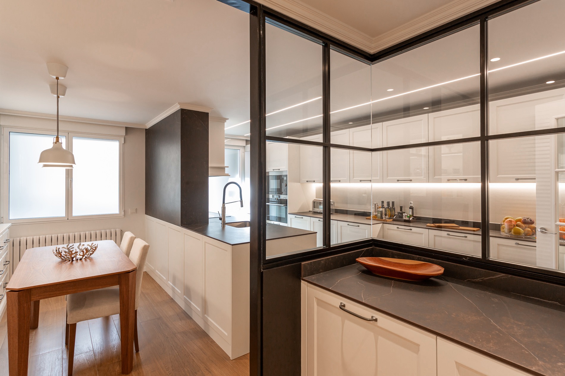 El principal cambio en la distribución general de la vivienda lo hemos realizado en la cocina-office, en el, se unifican dos pequeños espacios para convertirlo en el centro del día a día, una cocina amplia con zona de comedor y lavandería incluida.